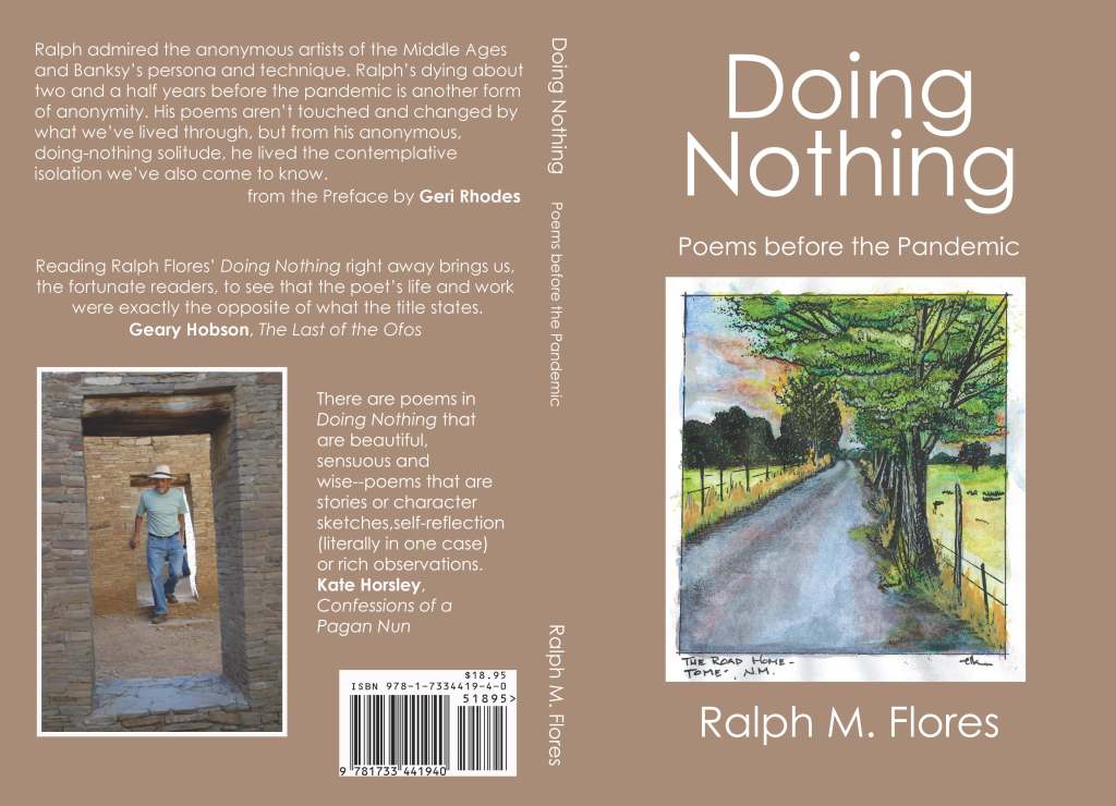 A note about the Curlz font that appears on the covers of most of Ralph’s books: UNM Press used Curlz on the cover of The Horse in the Kitchen, and like the snail petroglyph that appears as the logo of Tomé Lane Books, Curlz is a sort of trademark that I want to keep, even though to some it may appear a little quirky. Out of deference to the preference of Bob Christensen who designed the front cover of Doing Nothing, I used his Gothic font there.